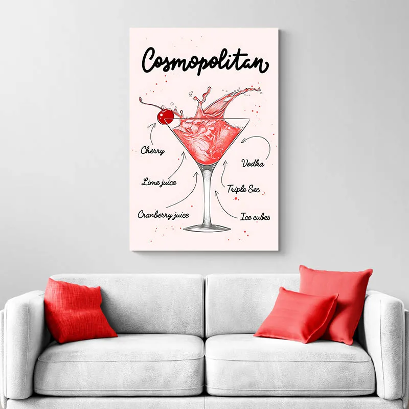 Cette affiche Cosmopolitan rose capture toute l’élégance d’un grand classique des bars à cocktails. Le verre martini, la cerise rouge, le splash vibrant et les ingrédients joliment calligraphiés... tout est fait pour rappeler les soirées chics et les ambiances feutrées, avec une touche très contemporaine.
