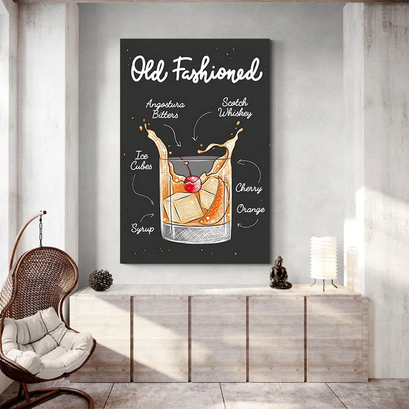 Ce qu’on remarque avec cette affiche Old Fashioned noire, c’est à quel point le fond valorise les détails : les glaçons paraissent plus froids, l’orange plus vive, le verre plus précis. C’est une pièce déco qui attire l’œil sans être trop flashy, parfaite pour un espace où le whisky est roi.