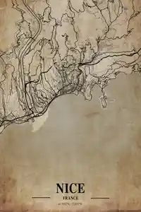 Cette affiche est une belle carte de Nice. On dirait une vieille carte, un peu usée mais pleine de charme. Les lignes noires se croisent, créant un dessin qui évoque des souvenirs lointains. Les teintes crème lui donnent un côté chaleureux, un petit goût de nostalgie, comme une belle journée d'été passée là-bas. Ça fait rêver, on se voit déjà flâner sur la Promenade des Anglais, profiter du soleil.