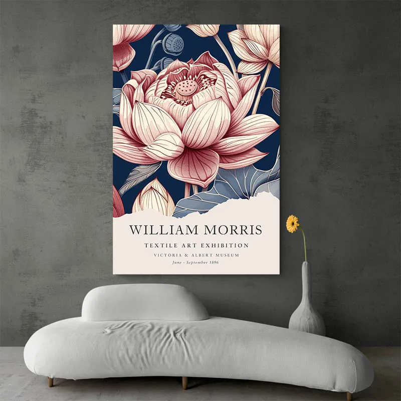 Ce qu'on ressent en regardant cette Affiche William Morris Lotus, c'est une forme de calme. Un apaisement immédiat. On se retrouve face à un décor floral tout en finesse, avec ces lotus délicatement dessinés, comme suspendus dans le temps. Le fond bleu profond donne de la profondeur, et les tons rosés des fleurs adoucissent l'ensemble. C'est à la fois élégant et très apaisant.