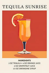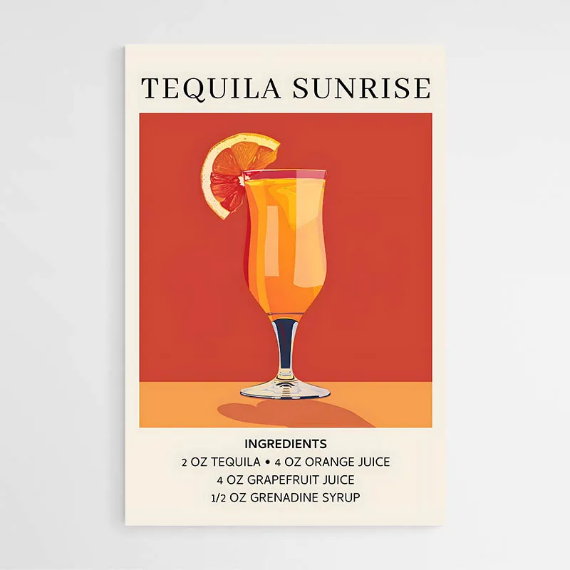 Envie de reproduire un Tequila Sunrise parfait ? Cette affiche "Ingrédients" est idéale. Chaque élément est illustré de manière ludique et claire : tequila, jus d'orange, grenadine. C'est beau, coloré, presque éducatif, mais avec style. L'affiche donne envie d'essayer, même à ceux qui n'ont jamais tenu un shaker.