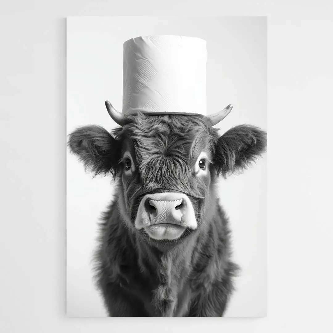 Difficile de ne pas sourire devant ce Tableau vache drôle. Cette vache au regard sérieux, affublée d’un rouleau de papier toilette en guise de chapeau, a tout pour faire fondre le cœur. Le contraste entre son expression calme et la situation absurde fonctionne à merveille. C’est simple, inattendu, et surtout, plein de tendresse.
