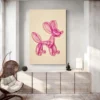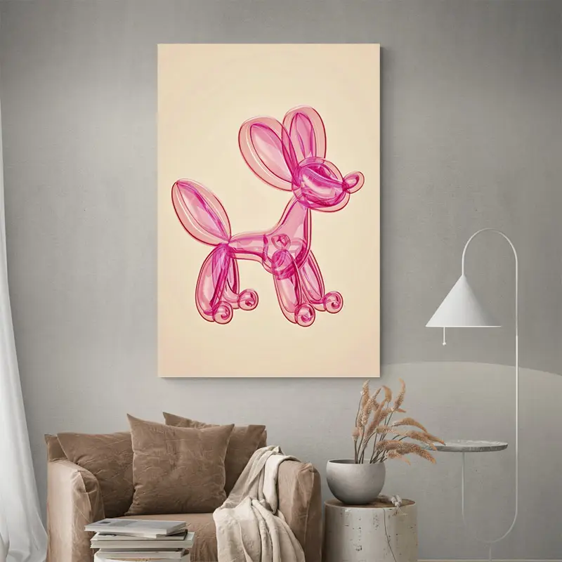 Le chien ballon est immédiatement reconnaissable, avec ses formes arrondies et légères. Le rendu translucide rose apporte une sensation de douceur, tout en restant très visuel sur le mur.