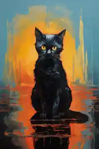 Ce que j'adore, c'est ce contraste entre le noir profond du chat et les couleurs chaudes autour. Des tons de jaune, d'orange, de rouge... un peu comme un ciel qui s'embrase juste avant la nuit. Et là, au milieu, ce chat qui ne bouge pas, mais qui vous regarde comme s'il savait quelque chose qu'on ignore.