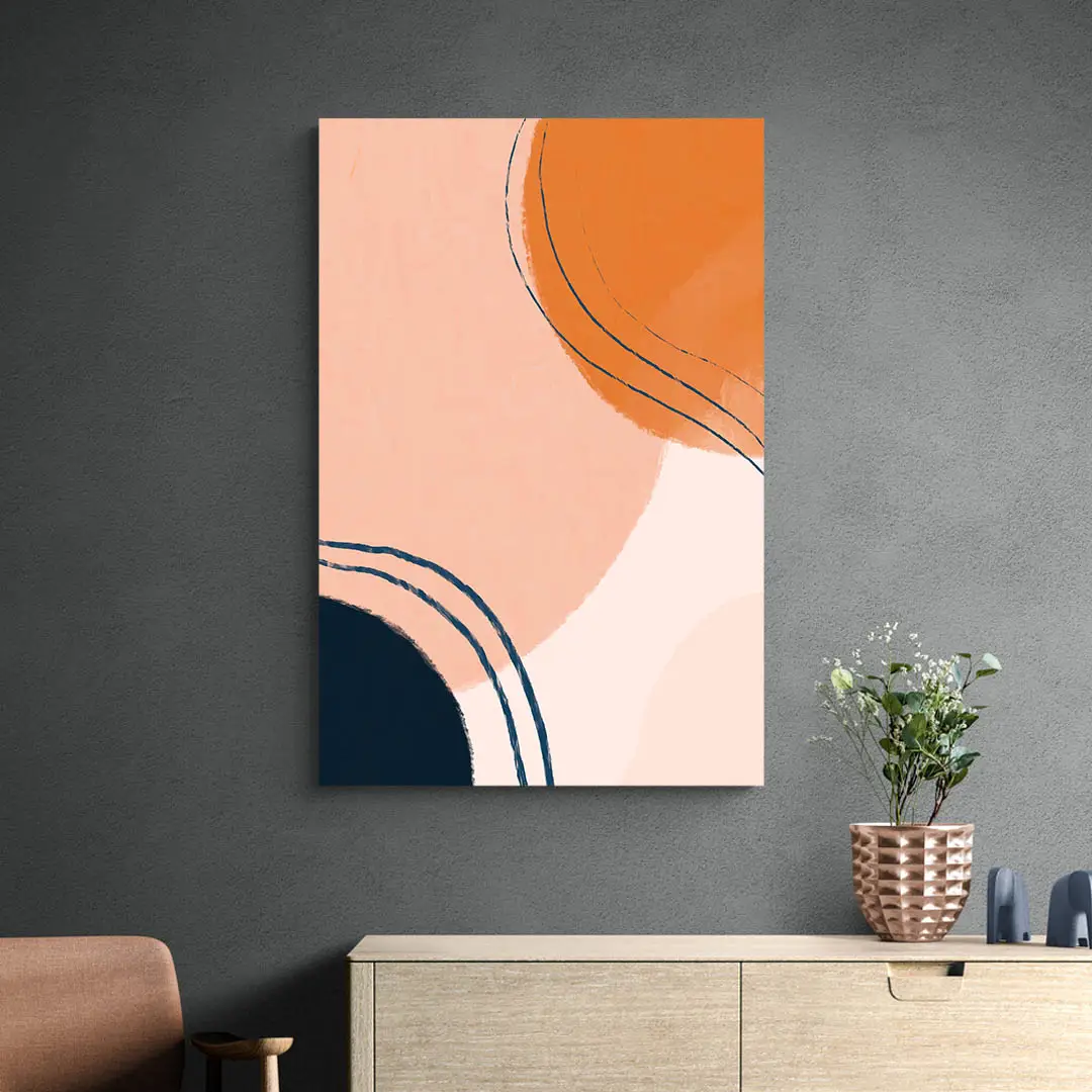 Avec ses formes arrondies et ses teintes douces, ce tableau abstrait couleur pastel insuffle un vent de sérénité dans n’importe quelle pièce. Ses nuances de pêche, de terracotta et de bleu marine s’entrelacent dans un mouvement fluide, presque méditatif. C’est le genre d’œuvre qui parle bas mais dit beaucoup.