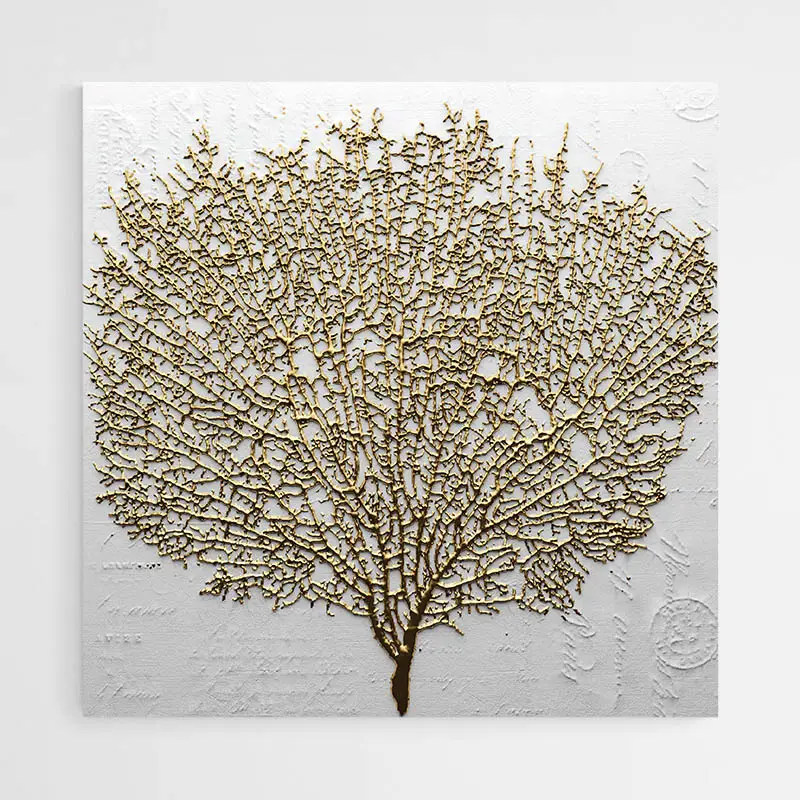 Ce tableau abstrait doré est inspiré de l'arbre de la vie, cet arbre est représenté avec des branches en or sur un fond blanc. La couleur or et le blanc se marient parfaitement. L'illustration de cette toile est simple et minimaliste. Une représentation abstraite qui s'adaptera très bien une déco sobre, simple de style scandinave. Si vous aimez la couleur or, ce tableau s'adaptera également à vos autres éléments de décoration. Par ailleurs son côté épuré et sa simplicité en feront un élément de décoration qui conviendra à tout type d'intérieur.