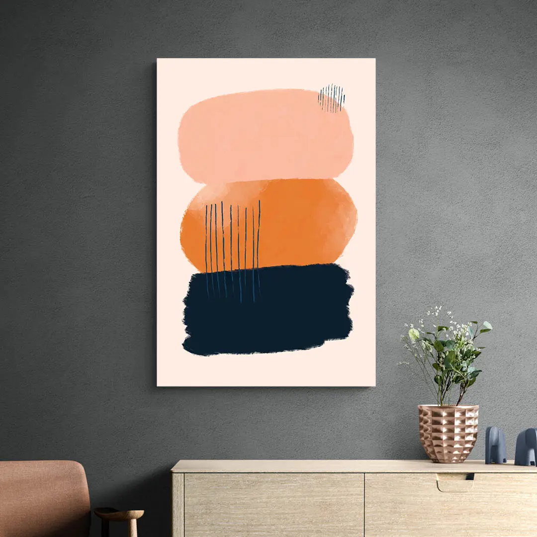 Ce tableau abstrait pastel, c’est un vrai petit bijou de simplicité et d’harmonie. On est tout de suite séduit par ces trois formes superposées, presque flottantes, qui donnent l’impression de tenir en équilibre comme par magie. Ce qui marque, c’est cette palette douce mais contrastée, entre rose pâle, orange chaleureux et bleu nuit intense. Un contraste tout en finesse, qui ne crie jamais mais qui attire vraiment le regard.