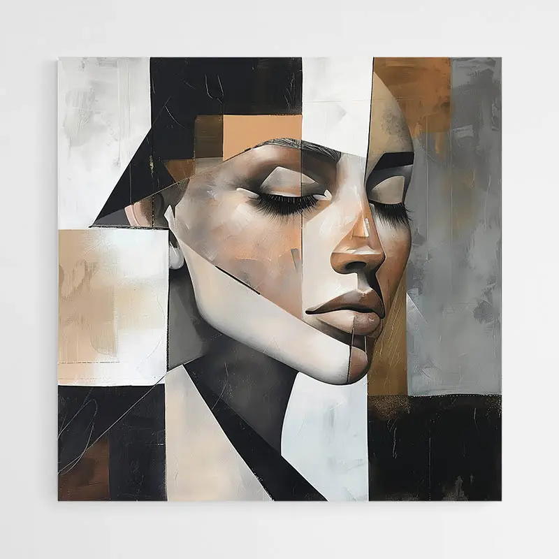 Ce tableau abstrait portrait femme, on le trouve tout simplement fascinant. Il ne dit pas tout, il suggère. Le visage est stylisé, presque esquissé, mais il y a une vraie présence qui se dégage. Les formes géométriques, les touches de beige, de noir, de blanc... tout est parfaitement équilibré. C'est sobre, chic, et surtout très apaisant.