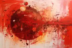 Ce qu'on ressent tout de suite en regardant ce tableau abstrait rouge, c'est une intensité folle. On est littéralement happé par cette sphère rouge qui trône au centre, comme une planète en fusion. On dirait qu'elle rayonne, qu'elle pulse, qu'elle aspire tout autour d'elle. Et ce filet de peinture qui y converge, c'est presque vivant.