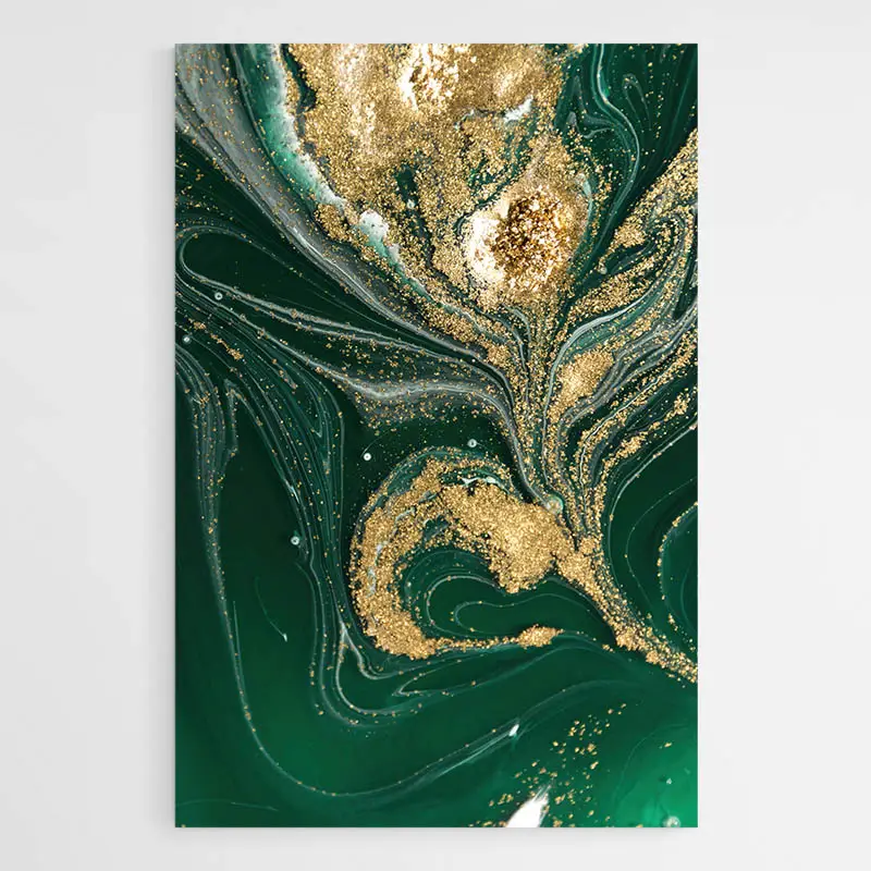Ce tableau abstrait verre est assez original laisse transparaître des nuées de paillettes dorées sur un fond d’encre verte.
