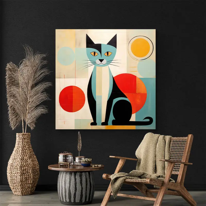 Ce tableau contemporain abstrait chat, c'est un petit bijou de subtilité. Il ne miaule pas, il ne bouge pas, mais pourtant... on sent presque sa présence. Ce chat-là, avec ses lignes épurées et son regard un peu énigmatique, il capte tout de suite l'attention. Il a ce calme qu'ont les vrais chats, mais avec une touche artistique en plus.
