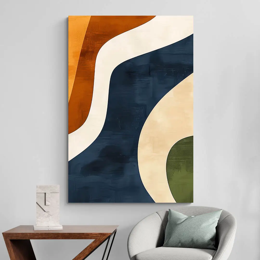 Ce qu’on aime dans ce tableau design couleurs, c’est sa palette bien dosée. Le bleu profond apporte du calme, le orange réchauffe, les tons beige unifient l’ensemble, et le vert olive ajoute juste ce qu’il faut de naturel. Le tout donne un résultat équilibré, contemporain, avec une touche rétro très subtile.