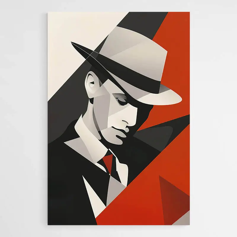 Ce tableau Homme Élégant Cubisme, on l'adore pour son côté à la fois graphique et ultra chic. C'est un peu comme si l'élégance d'un homme en costume s'était glissée dans un rêve cubiste. Le chapeau, les lignes anguleuses, les jeux de rouge, de noir et de gris... tout est là pour capter le regard. Il y a quelque chose de mystérieux dans ce visage stylisé, comme une énigme en plein mur. Et franchement, on ne s'en lasse pas.
