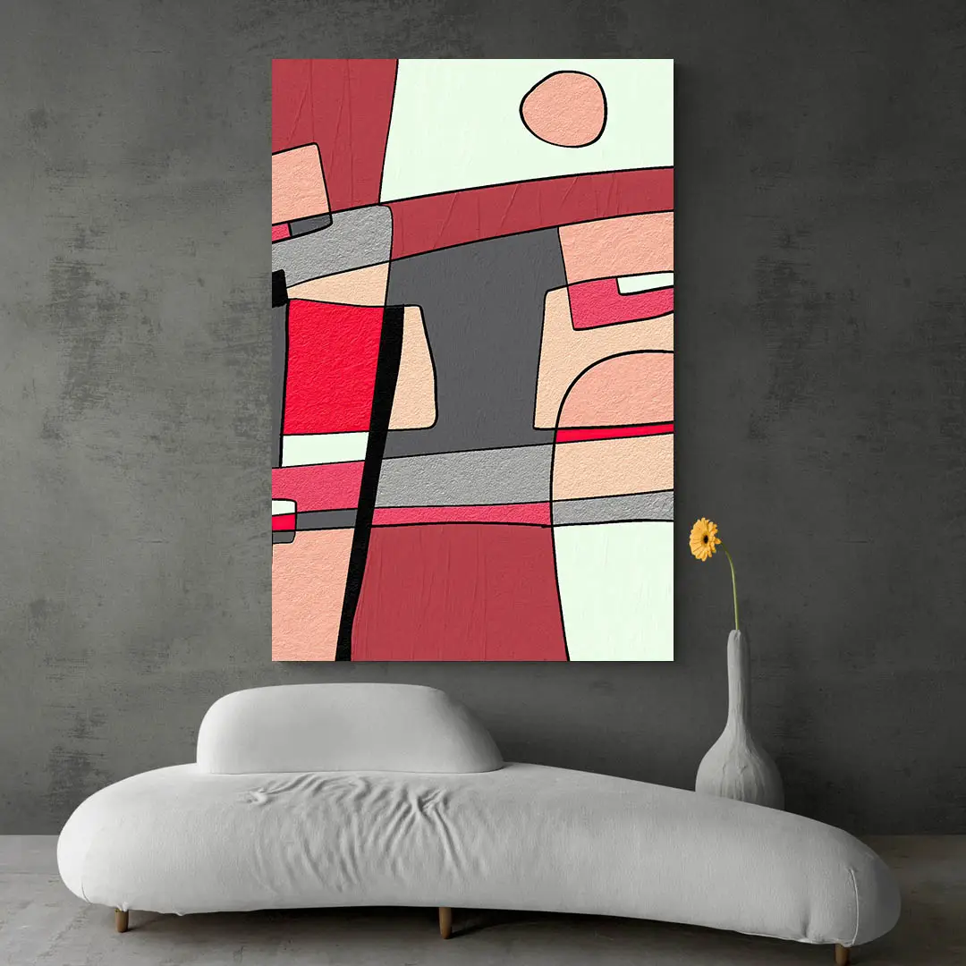 Installez-le sur un mur clair pour laisser respirer les formes. Ajoutez un meuble aux lignes simples (bois clair ou noir mat) pour prolonger l’effet graphique sans surcharger la pièce.