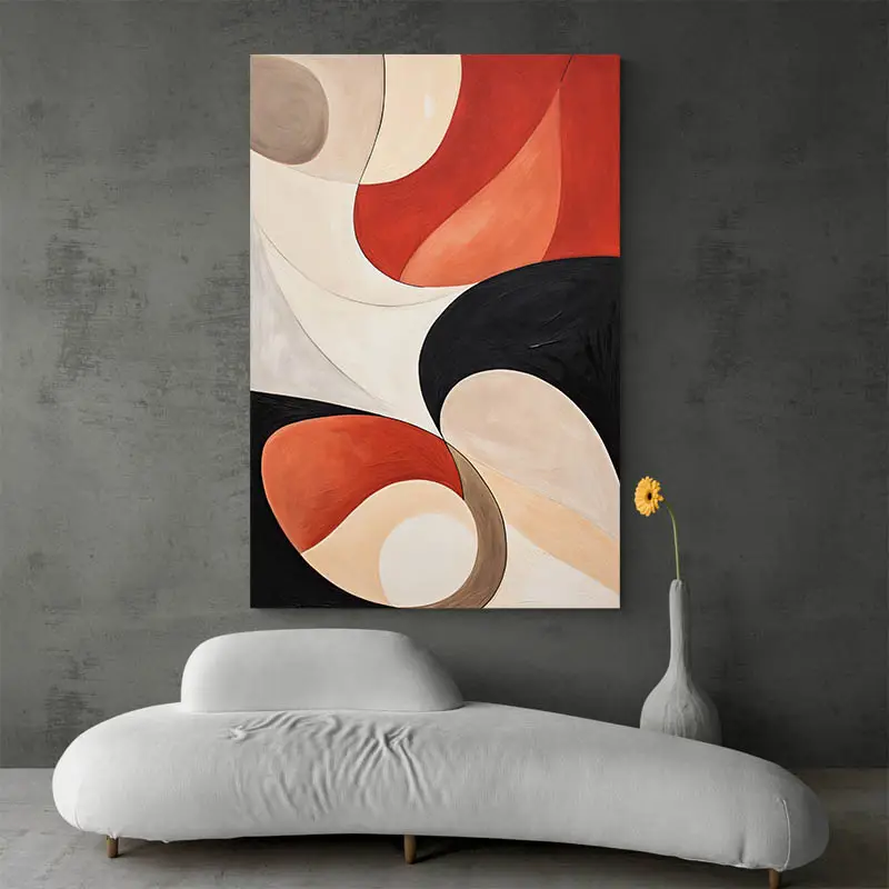 Ce tableau salon moderne, il a vraiment quelque chose. Dès qu'on le regarde, on sent l'énergie. Le rouge profond, le noir intense, et ces touches plus douces qui équilibrent l'ensemble... ça fonctionne tout de suite. C'est le genre de tableau qui donne du relief à un mur, sans jamais en faire trop.
