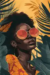 Ce poster femme afro jaune et vert, on l'adore. Cette femme, entourée de grandes feuilles vertes, a ce petit truc qui attire direct l'œil. Avec ses lunettes stylées et ses boucles dorées, elle dégage une vraie élégance moderne, sans en faire trop.