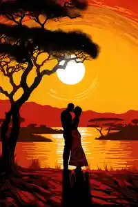 Le Tableau Couple Africain, c'est un vrai moment de tendresse accroché au mur. On y voit deux silhouettes complices, dans une lumière chaude de fin de journée, comme si tout s'était arrêté autour d'eux. Rien que leur présence, et ce ciel rouge-orangé qui les enveloppe.