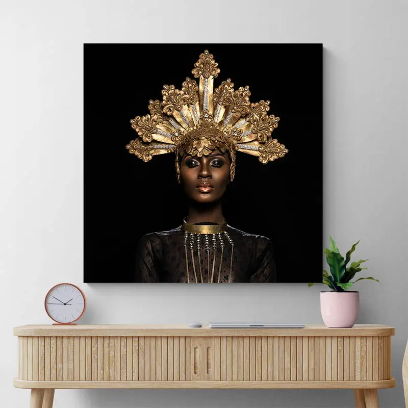 À travers ce tableau d'une femme africaine et de ses bijoux, l'artiste a voulu insister sur le charme et le mystère de la femme africaine. En effet, l'or symbolise la lumière et la perfection, mais aussi la richesse spirituelle. Cette toile donnera donc une autre tout autre dimension à votre décoration. Elle créera un contraste saisissant sur un mur blanc ou au contraire se fondra sur un mur sombre.