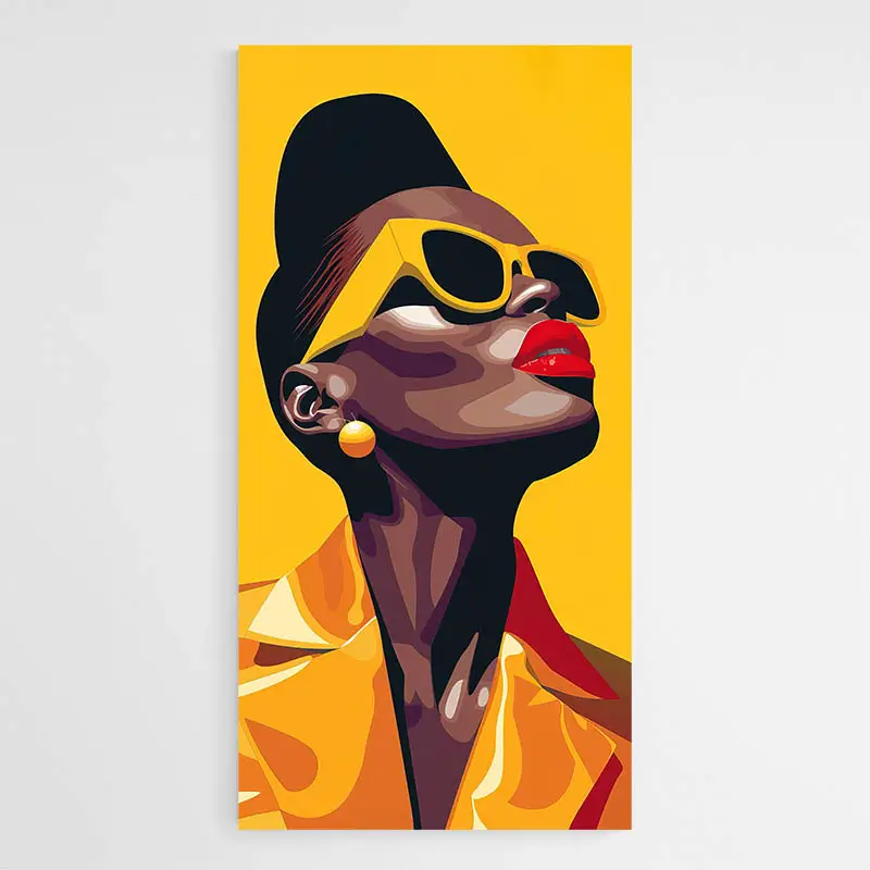 Ce tableau femme afro jaune, c'est comme un rayon de soleil qui s'invite chez vous. Impossible de ne pas le remarquer. Ce jaune vif, franc, éclatant, donne tout de suite le ton. Et ce visage, fort, élégant, c'est vraiment le genre de portrait qui apporte du style, du caractère et de l'énergie à une pièce.