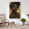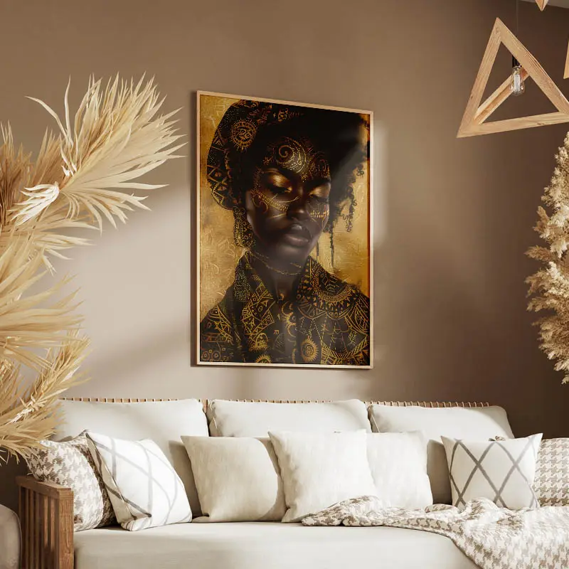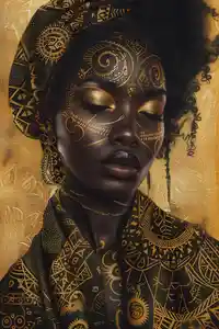 Franchement, ce tableau femme noire et dorée, il en impose. Il a ce petit truc royal, comme un hommage vibrant à la beauté, à la dignité, aux racines. Le doré qui illumine chaque détail, le foulard enroulé comme une couronne, les motifs délicats sur le visage... Tout est là pour capter le regard et raconter une histoire.