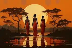 Ce Tableau Silhouette Africaine, c'est un instant figé dans la lumière du crépuscule. Un moment de calme profond, comme si tout s'était arrêté au cœur de la savane. Trois femmes, debout. On ne voit que leurs silhouettes, et pourtant... on devine tout : la grâce, la force, la douceur aussi. Et derrière elles, ce ciel orange qui semble encore brûler de la chaleur du jour. L'effet miroir de l'étendue d'eau rajoute de la profondeur à la composition.