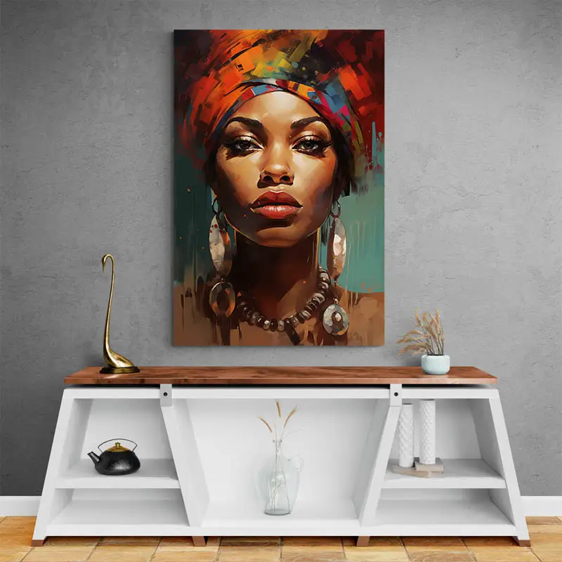 Ce portrait est une symphonie de couleurs vives, mélangeant l'audace et la grâce. Le turban aux teintes éclatantes symbolise la diversité et la créativité de l'Afrique. La palette, riche et chaleureuse, insuffle énergie et vitalité à votre intérieur.