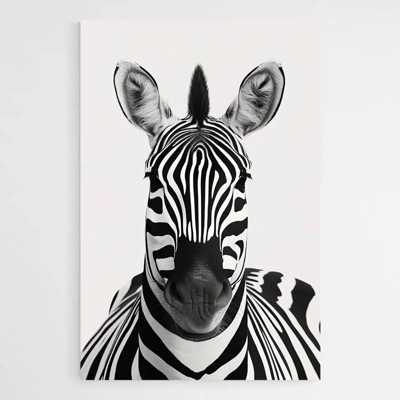 Ce tableau zèbre de face, on ne peut pas vraiment passer à côté. Il y a ce regard droit, intense, presque magnétique. Le noir et blanc des rayures fait vibrer l'ensemble, comme un jeu d'optique élégant et sauvage à la fois. C'est un tableau qui attire l'œil dès qu'on entre dans la pièce. Et plus on le regarde, plus on y voit de détails, de nuances, de textures.