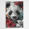 Ce tableau tête de panda a quelque chose de magique. Peut-être que c’est son regard bleu saisissant, peut-être que ce sont les fleurs rouges, blanches et orangées qui l’entourent… ou peut-être que c’est simplement cette expression à la fois calme et curieuse qui nous attrape dès les premières secondes. Une chose est sûre : il ne laisse pas indifférent.