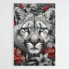 Il y a dans ce tableau tête de puma une intensité qu’on oublie difficilement. Les yeux d’un bleu profond captent immédiatement l’attention, presque hypnotiques. Autour de lui, un décor floral en noir et blanc, rehaussé de quelques fleurs rouges et orangées. Le contraste est puissant, mais parfaitement maîtrisé.