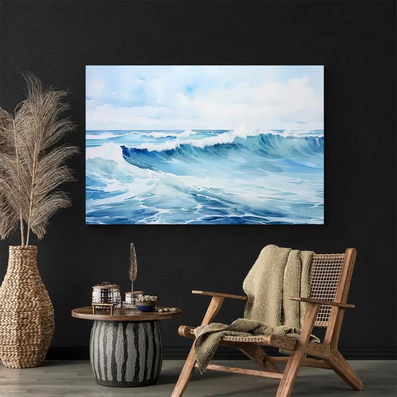 Il est idéal pour créer une ambiance sereine dans un salon, une chambre ou même un bureau. Il fonctionne aussi très bien dans une salle de bain lumineuse, pour apporter une touche d'évasion. Si vous aimez cette atmosphère marine, on vous conseille de l'associer au tableau Aquarelle Bleu ou au tableau Bord de Mer pour composer un mur apaisant.
