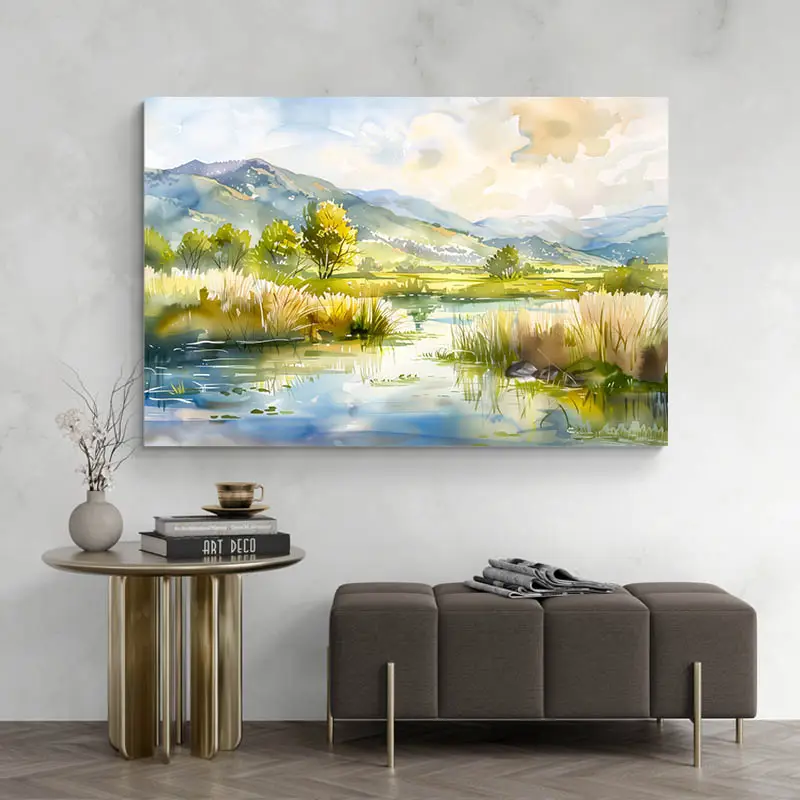 Ce tableau aquarelle paysage ressemble à un souvenir flou. On distingue un champ, un horizon, peut-être une colline... Mais rien n'est net. Tout est impression, ressenti. Comme si on revivait un moment de calme dans la nature, sans en retenir les détails. C'est ce flou maîtrisé qui fait toute la beauté de ce tableau.