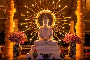 Ce qu'on aime dans ce tableau déco de Bouddha, c'est sa douceur. Il y a une vraie sensation de sérénité qui s'en dégage. On y voit une statuette blanche de Bouddha, posée avec soin sur un petit autel décoré de bougies et de fleurs. Tout autour, une lumière douce, presque magique, dessine un arc lumineux au-dessus de sa tête. Et là, tout de suite, on sent une ambiance réconfortante.