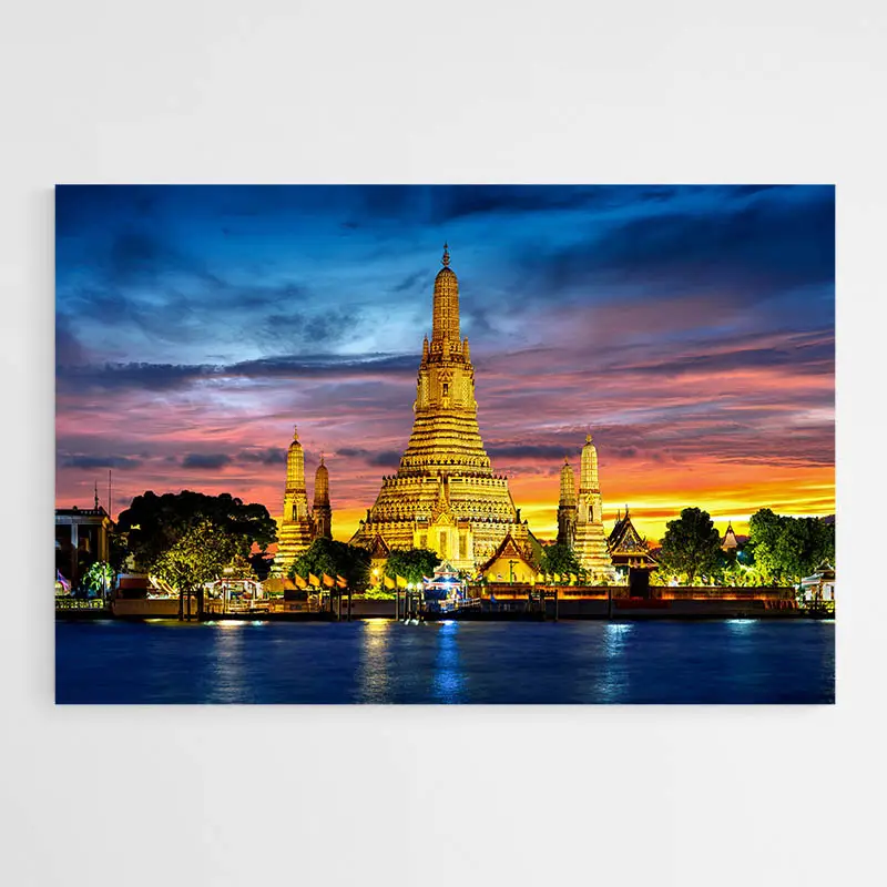 Ce qu'on ressent en regardant ce tableau, c'est un vrai moment de calme... et d'émerveillement. On se retrouve face au célèbre temple Wat Arun, photographié de nuit, au cœur de Bangkok. Il se dresse avec élégance, tout en lumière, au bord du fleuve Chao Phraya. Franchement, on a presque l'impression d'y être.