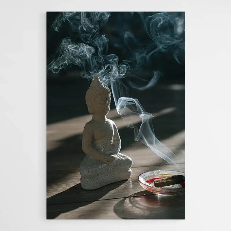 Franchement, ce tableau, c'est le genre de pièce qui apaise rien qu'en la regardant. On y voit une jolie statuette de Bouddha, posée là, calmement, dans la fameuse posture du lotus. Ses mains ouvertes vers le ciel, comme prêtes à recevoir... on ressent tout de suite cette sensation de calme et d'ouverture. À ses côtés, un petit bâtonnet de bois aromatique libère une fine fumée qui s'élève lentement. On dirait presque qu'elle danse. Et ça, ça apporte une touche vraiment magique à l'ensemble.