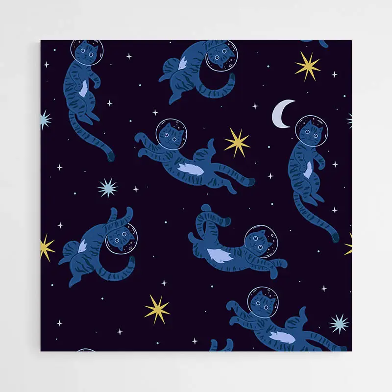 Les chats sont certainement les animaux de compagnie les plus populaires avec nos amis les chiens. Ils font rêver nos enfants, car ils ressemblent à de véritable peluche avec leurs coussinets, leurs grandes moustaches et leurs fourrures. Ce tableau de chat rigolo mettant en scène plusieurs chats cosmonautes flottant dans l'espace au milieu des étoiles est donc parfait pour la chambre de votre bambin. Il est à la fois moderne, coloré et mignon. Idéal pour passer de bonne nuit en compagnie de nos félins favoris.