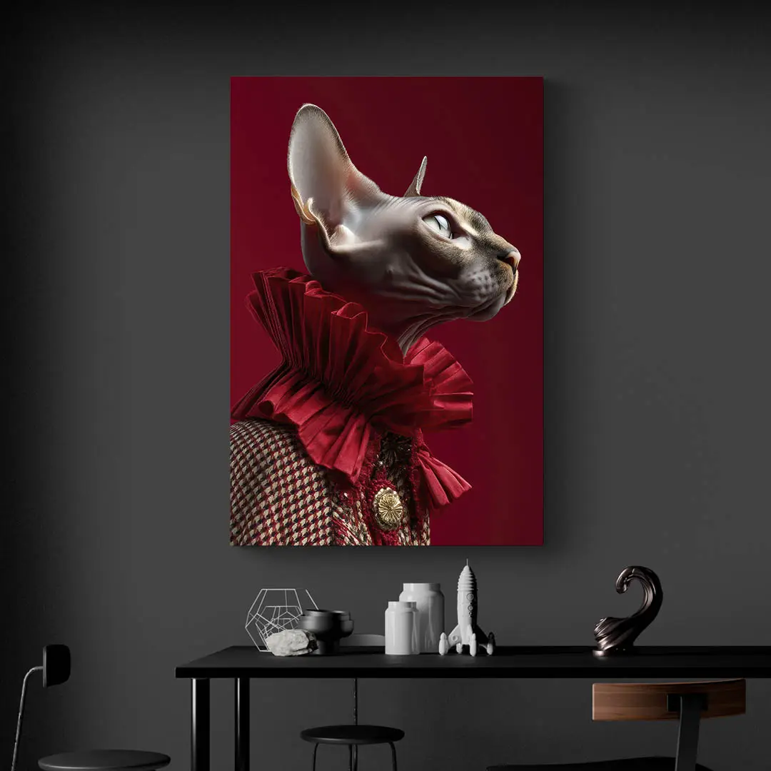 Ce tableau chat sphynx ne laisse personne indifférent. Avec son port de tête fier, son regard perçant et son costume digne d’un roi d’une autre époque, ce chat nous offre un véritable défilé visuel. Sur un fond rouge profond, chaque détail ressort : le col plissé, la texture du tissu, l’éclat doré de la broche… c’est à la fois chic, théâtral et plein d’autodérision.