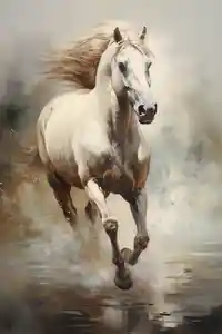 Ce qu'on voit, c'est un cheval blanc, magnifique, lancé à pleine vitesse. Mais ce qu'on ressent, c'est tout autre chose : la liberté pure. Il court comme s'il s'échappait du tableau, porté par le vent, entre ciel et terre. On dirait qu'il vole. Honnêtement, c'est fort.