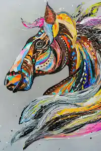 Les coups de pinceau de différentes couleurs sur cette peinture d'un cheval multicolore forment la crinière de l'animal. La crinière du cheval est un excellent sujet de représentation notamment dans le domaine de l'abstrait. Les couleurs utilisées sont un mixte entre des couleurs chaudes et froides pour créer un contraste saisissant. Ce tableau multicolore conviendra à tous les fans d'équitation et à une décoration sobre et avec une dominante de blanc et de gris.