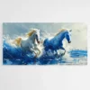 Les nuances de bleu évoquent la mer, créant une atmosphère apaisante et vivifiante à la fois. Le mouvement des chevaux, avec leur crinière flottante, exprime une sensation de liberté. Vous pouvez facilement l'associer à des tons neutres comme du blanc, du beige ou du gris clair pour un effet chic. N'hésitez pas à encadrer cette œuvre dans un cadre en bois clair pour un rendu naturel. Ajoutez des accessoires marins ou des plantes vertes pour renforcer l'harmonie dans la pièce.