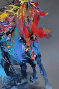Sublimez votre décoration d'intérieur avec ce Tableau d'un Cheval abstrait ! Il s'adaptera à merveille dans votre déco grâce à ses nuances de bleue de jaune et de rouge. En plus de ses couleurs simples, l'œuvre est très travaillée nous pouvons donc apercevoir un bel étalon au galop ressortir de ses coups de pinceau approximatifs.