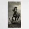 Ce tableau en noir et blanc est une véritable ode au mouvement, une illustration vivante de la beauté sauvage et indomptée. L'usage du monochrome renforce l'intensité dramatique de la scène, tandis que les éclats de la terre sous ses sabots ajoutent une texture et une dynamique palpables.