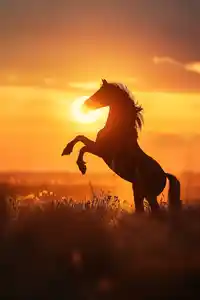 Tableau cheval qui cabre au coucher de soleil, ce moment suspendu entre ciel et terre