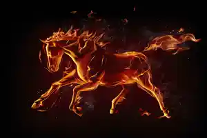 Il symbolise sa vivacité, son explosivité et sa force naturelle et sauvage. Ces flammes rouges sur ce fond noir donnent un contraste puissant et mettent en valeur la silhouette du cheval.