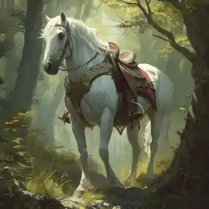 Ce tableau cheval sellé, on dirait qu'il sort tout droit d'un conte. Le cheval blanc est là, calme mais prêt à partir, comme s'il attendait juste qu'on grimpe en selle pour démarrer l'aventure. Sa posture est fière, sa robe brille, et cette selle richement décorée donne un côté noble à l'ensemble.