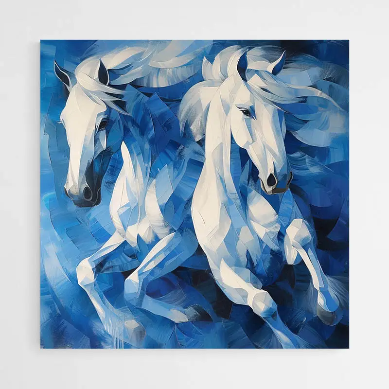 Le bleu, parlons-en. Il est partout, mais pas oppressant. Un bleu profond, presque nuit par endroits, puis plus clair, plus lumineux, qui éclaire le mouvement. J'aime bien le regarder le matin, avec la lumière du jour qui change un peu les reflets, ça donne une ambiance différente a chaque fois. Et puis ces chevaux... on sent leurs muscles, leurs crinières qui volent, comme si le vent soufflait rien que pour eux. Ça transporte, vraiment.