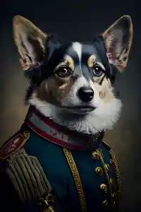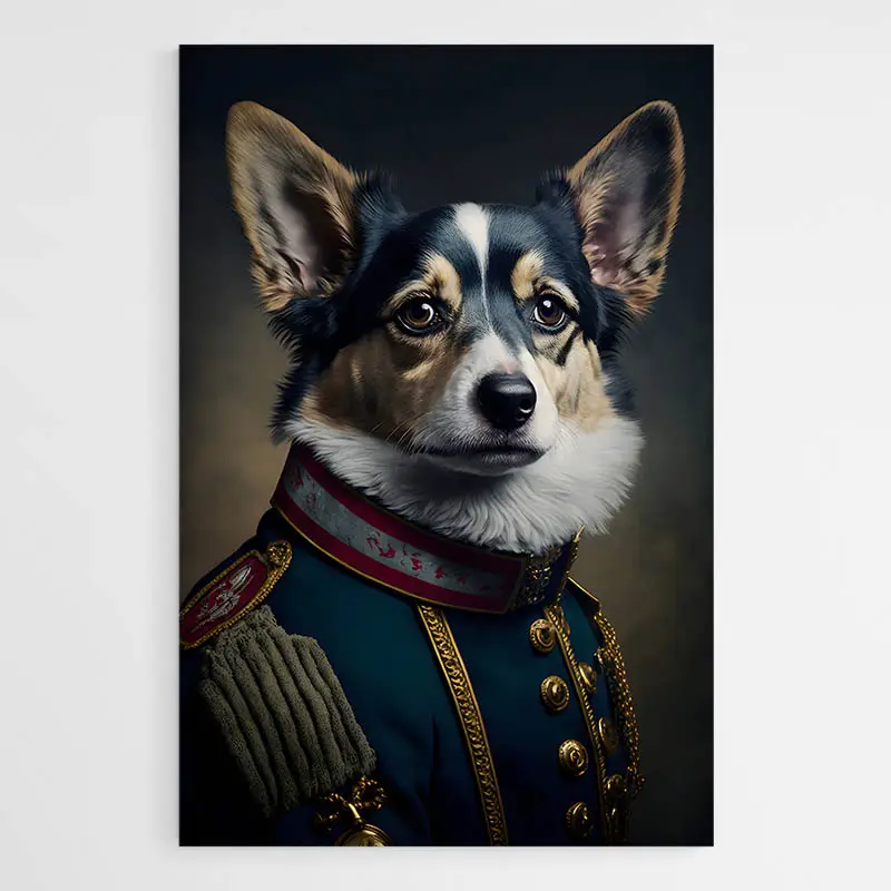 Ce tableau d'un chien aristocrate est une œuvre d'art décalé. Ce portait représente donc la tête d'un petit chien avec un corps d'humain vêtu d'un uniforme bleu très formel avec des épaulettes, un col rouge et des boutons dorés.