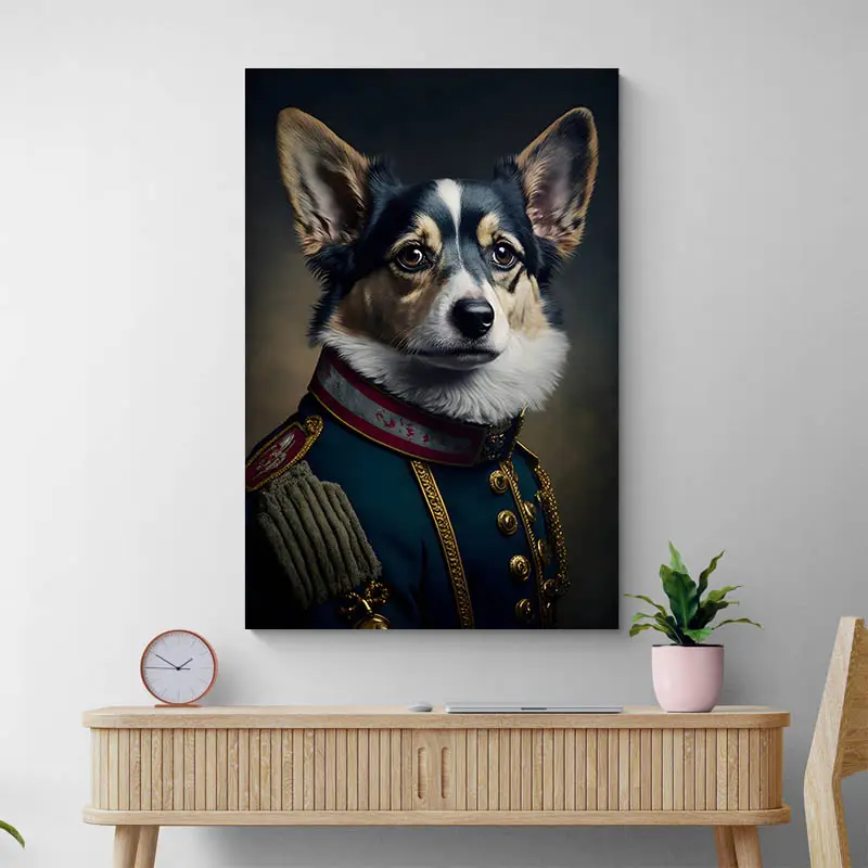 Ce tableau d'un chien aristocrate est une œuvre d'art décalé. Ce portait représente donc la tête d'un petit chien avec un corps d'humain vêtu d'un uniforme bleu très formel avec des épaulettes, un col rouge et des boutons dorés.
