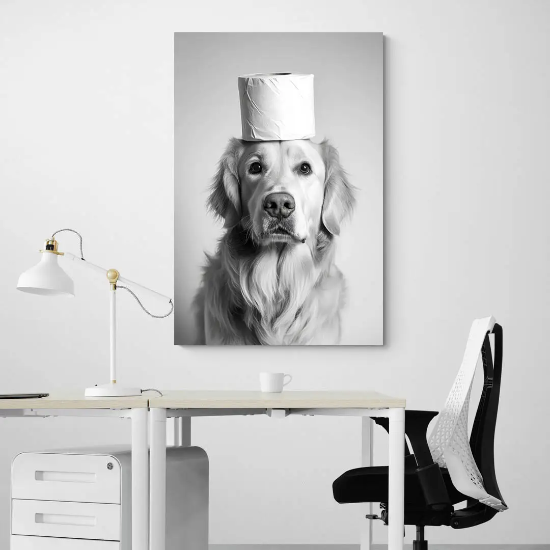 Ce Tableau Chien Drôle fait sourire dès qu’on le regarde. Un toutou au regard sérieux, un rouleau de papier posé sur la tête, et cette allure tellement digne qu’on en rit encore plus. C’est le genre d’image simple, mais pleine de charme. Celle qui rend une pièce plus vivante, plus humaine.