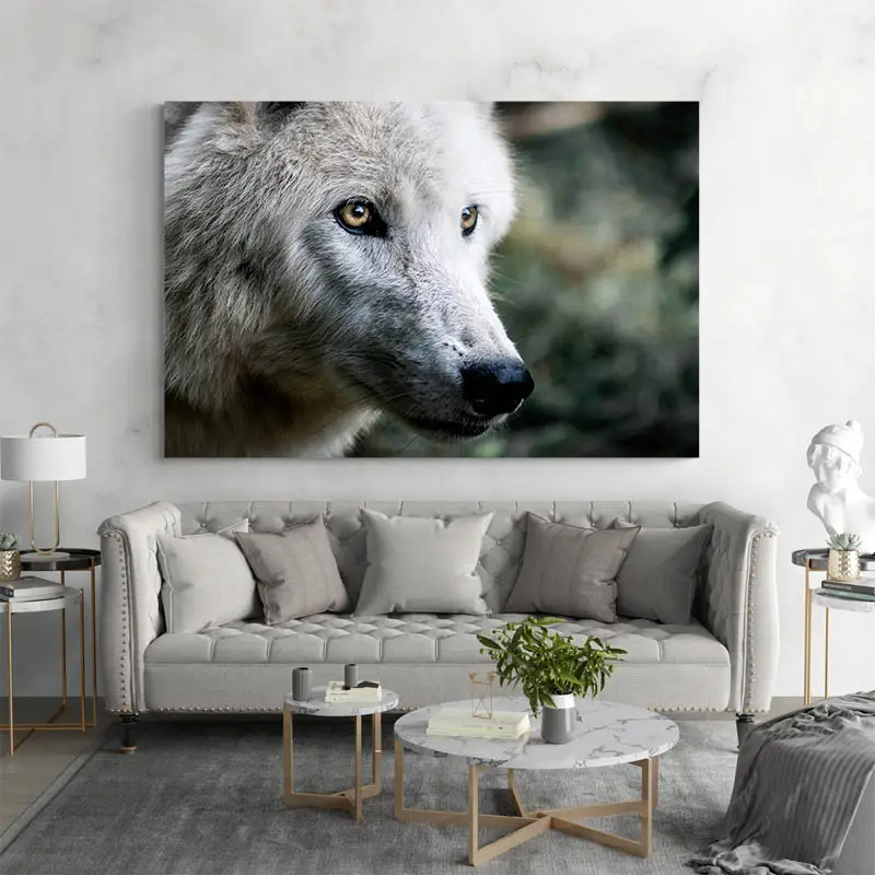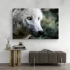 Ce tableau d'un chien loup est une photographie en gros plan de la tête d'un chien loup. Ces derniers ont un pelage épais en danse, de beaux yeux d'amandes. Celui représenter sur ce tableau a un pelage blanc et un regard perçant qui fixe l'horizon. C'est un tableau aux caractéristiques sauvage ou l'on peut observer un animal en pleine nature. Il se fondra donc parfaitement dans une décoration d'intérieur sur le thème des chiens ou de la nature.