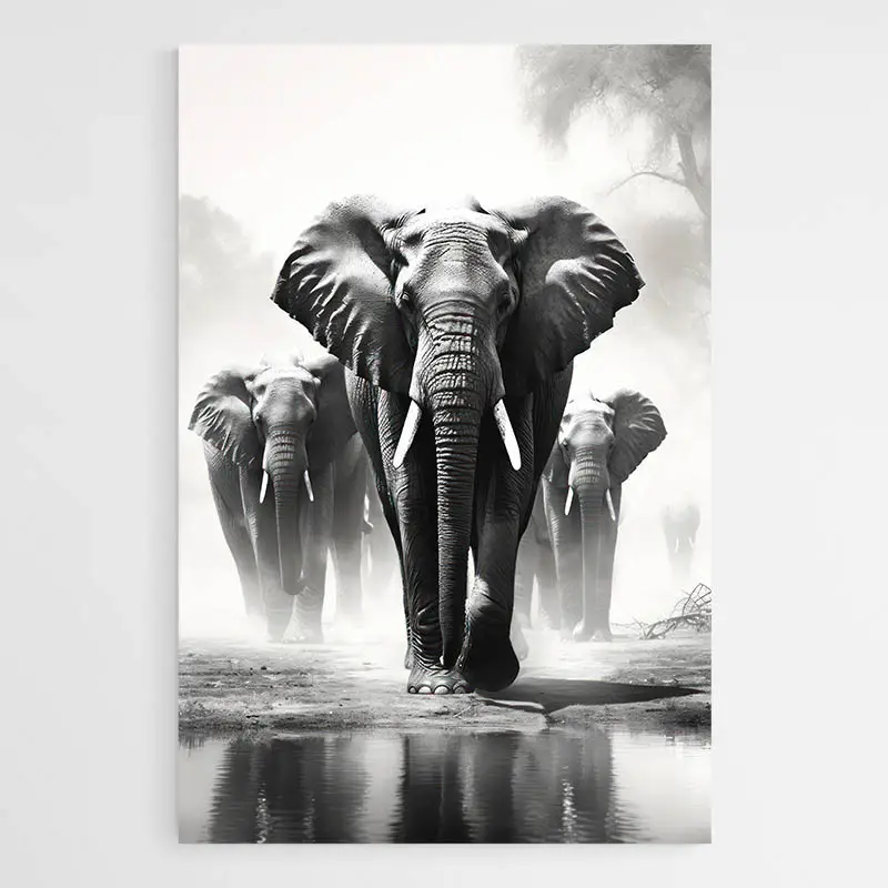 Ce tableau éléphant noir et blanc, c'est plus qu'une simple image. On sent toute la sagesse de l'animal à travers ces nuances contrastées. La texture de sa peau, les rides profondes, ses défenses puissantes... tout est là, en pleine lumière, et ça donne vraiment envie de s'arrêter un instant. Comme si l'éléphant allait sortir du cadre pour venir vous saluer.